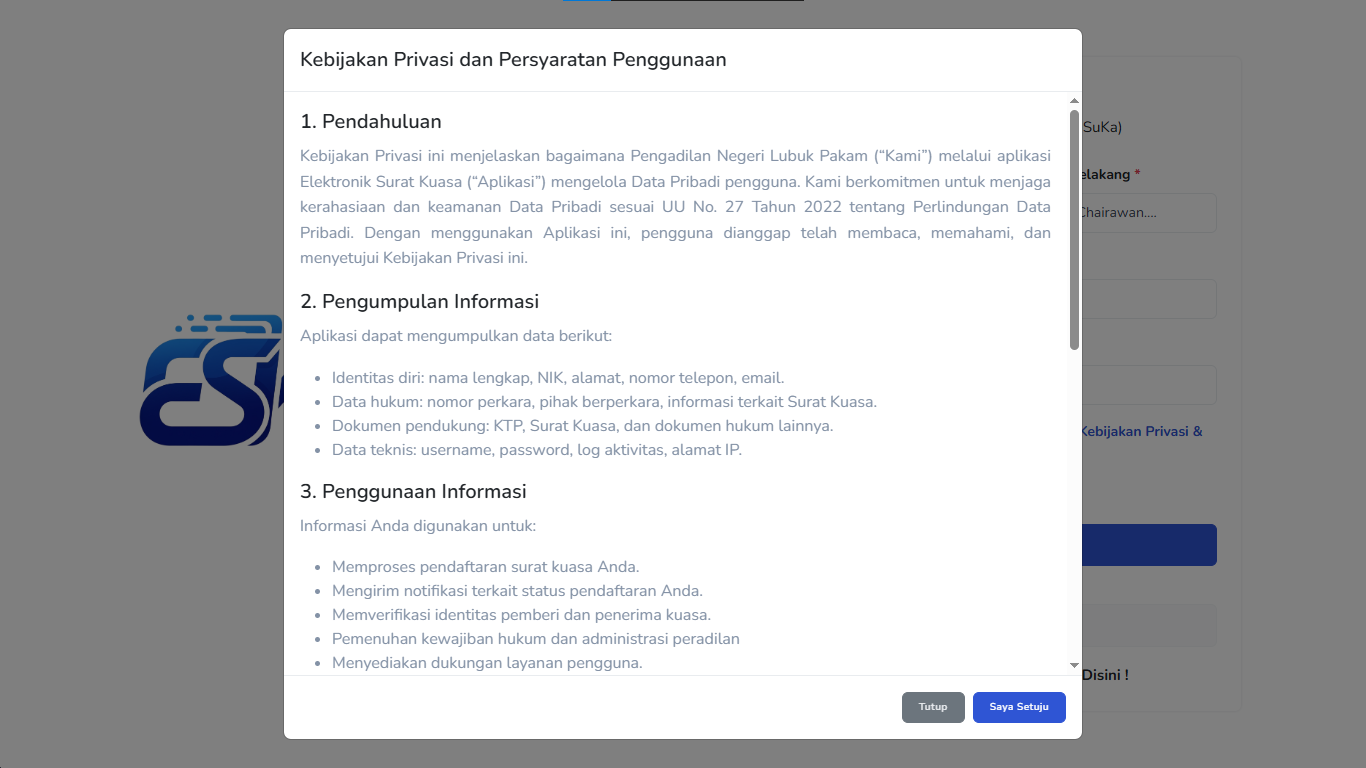 Konfirmasi persetujuan penggunaan informasi data pribadi Kamu untuk proses layanan pendaftaran Surat Kuasa.