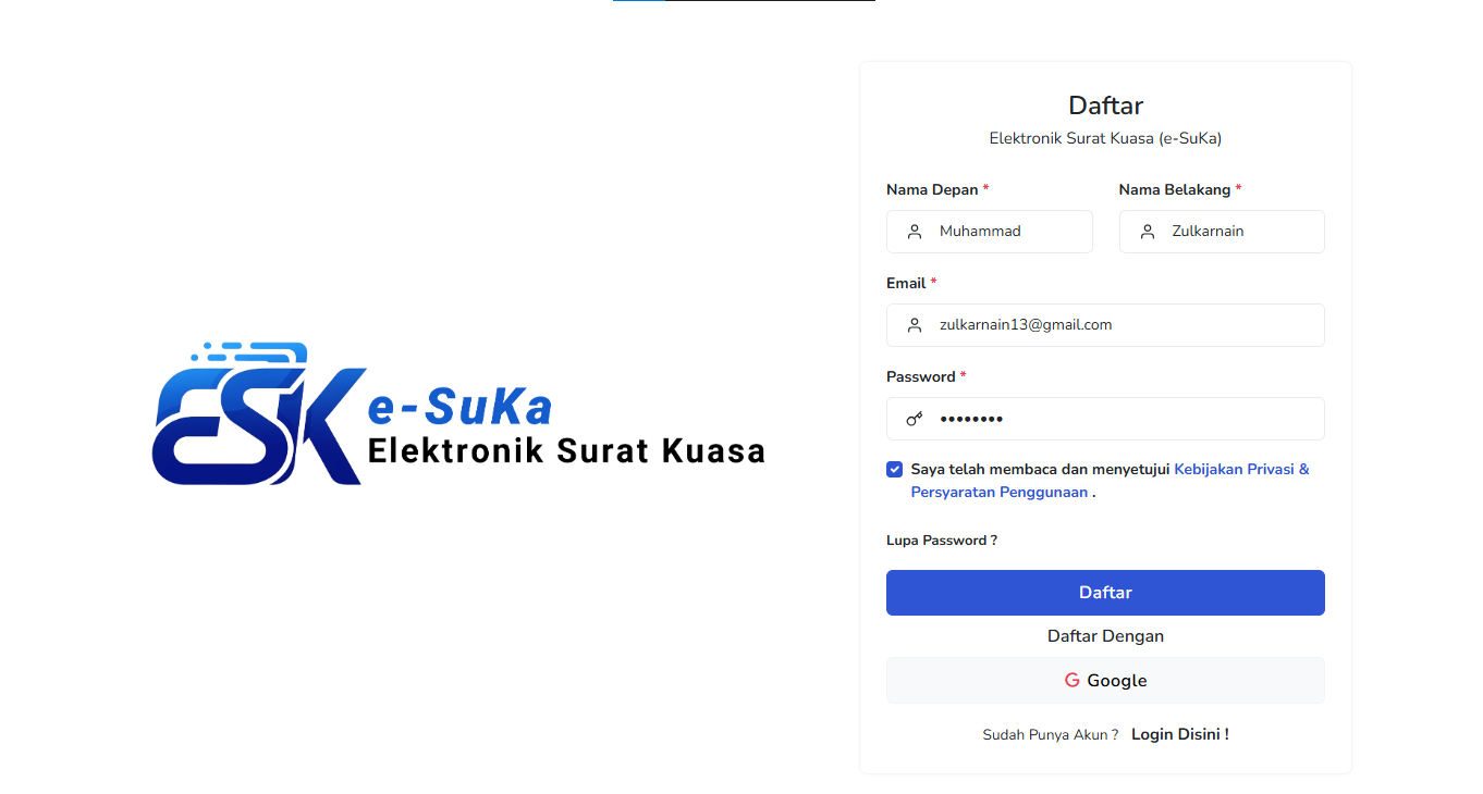 Untuk mendaftar akun di layanan Elektronik Surat Kuasa (e-SuKa), pastikan Kamu memiliki email aktif.