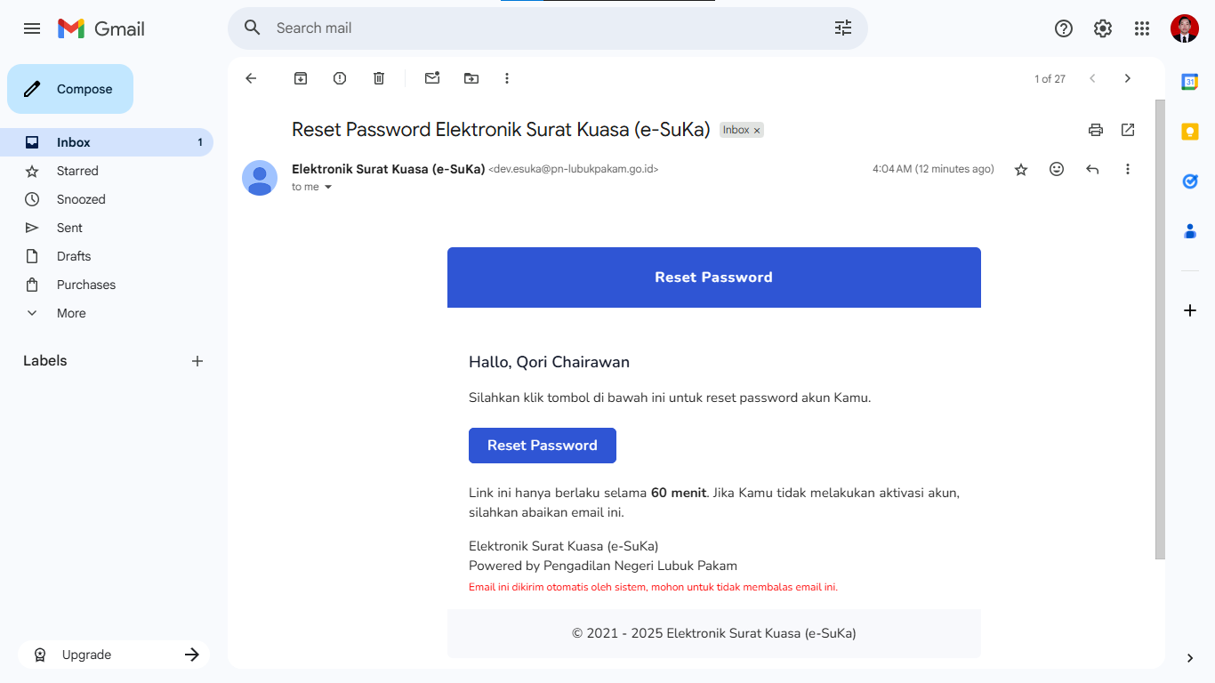 Klik tombol Reset Password untuk mereset password, link hanya berlaku 60 menit.