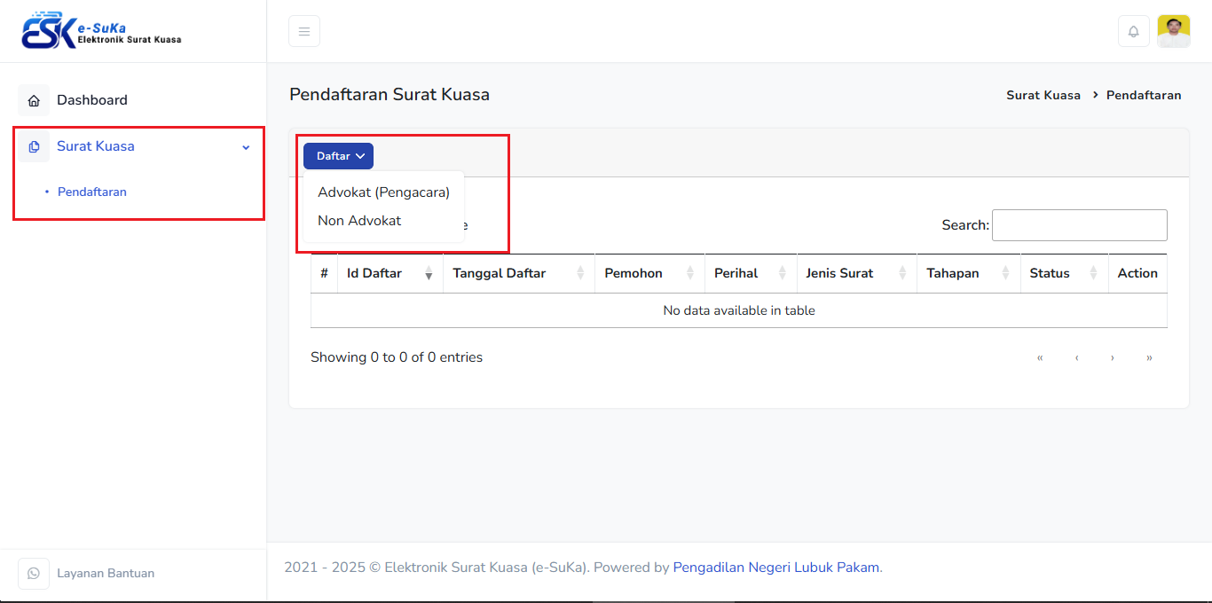 Klik menu Surat Kuasa kemudian pilih Pendaftaran. atau dapat mengklik link berikut Pendaftaran. Setelah terbuka silahkan Klik Tombol Daftar berwarna biru dan pilih jenis surat kuasa (Advokat/Non Advokat)