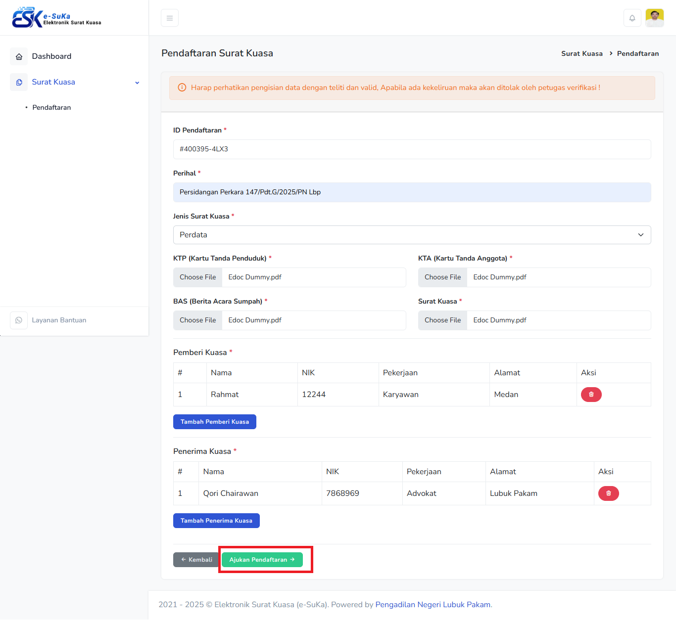 Isi formulir pendaftaran surat kuasa dengan data yang lengkap dan benar. Pengisian data yang salah dapat berakibat ditolaknya pendaftaran surat kuasa. Jika sudah mengisi formulir silahkan klik tombol Ajukan Pendaftaran berwarna hijau.