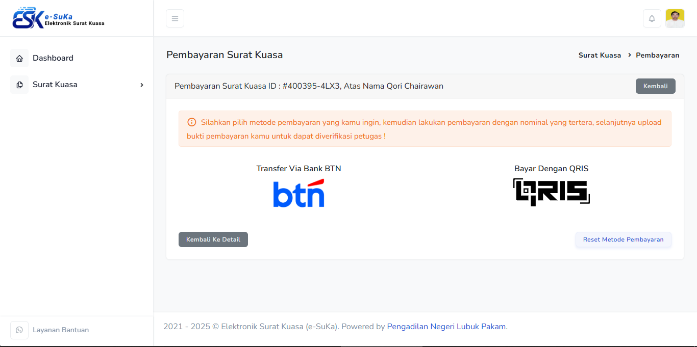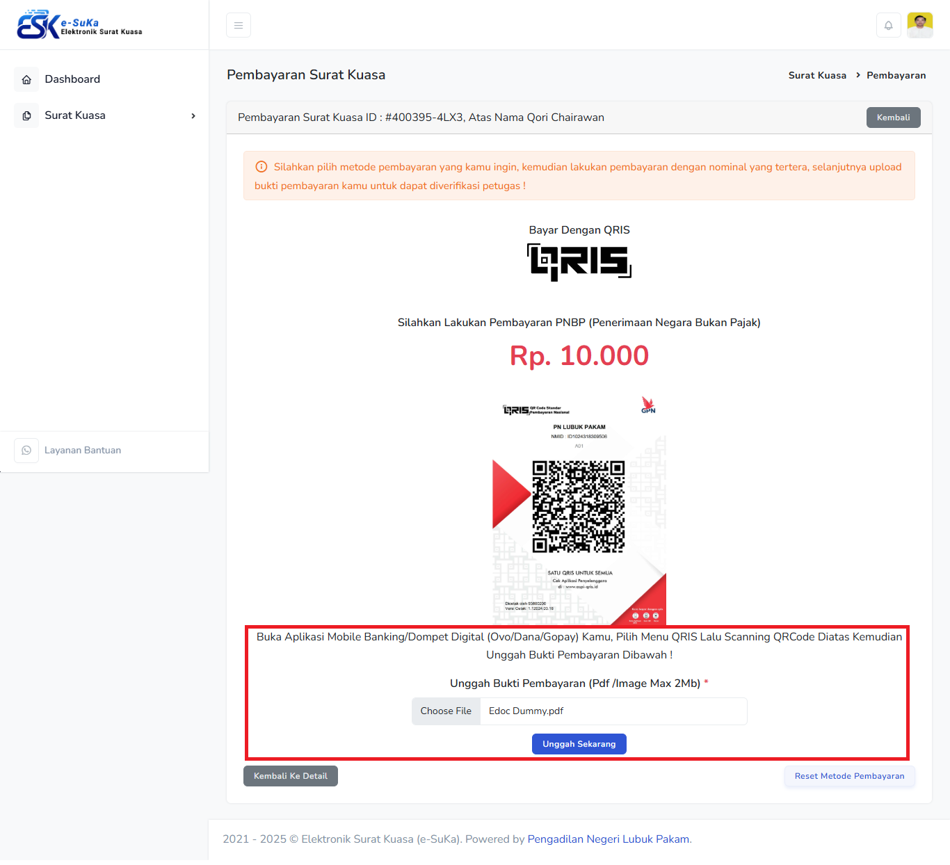 Contoh Pembayaran dengan QRIS tanpa biaya admin. Lakukan pembayaran surat kuasa dengan nominal Rp.10.000, lalu unggah bukti pembayaran dan Klik tombol Unggah berwarna biru.